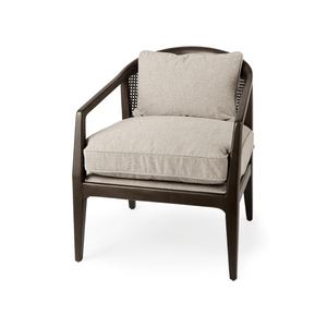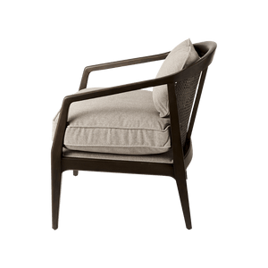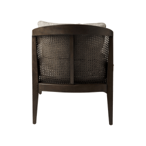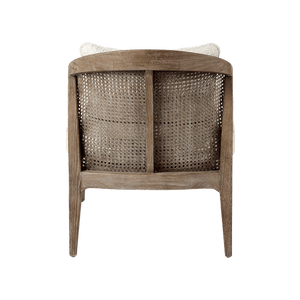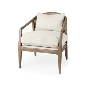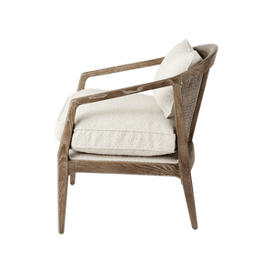 A solid wood armchair that blends organic tones and Mid-Century simplicity. Featuring a beautiful white boucle fabric upholstery and the added detail of a cane back.