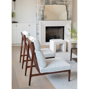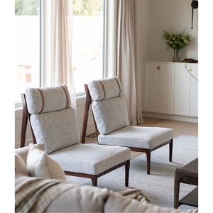 The Studio Accent Chair is a statement piece for your living room. Featuring a unique frame, grey boucle upholstery, leather straps and a beautiful wood tone.