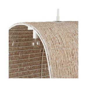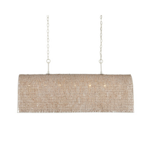 One of the most surprising inspirations we've seen in a while, the Aztec Rectangular Chandelier is shaped like an inverted taco! The designer, Clarence Mallari, is staying true to his desire to work with natural elements in surprising ways by having the shade covered in row upon row of small wood beads that have been whitewashed. Because the distressed finish still allows some of the wood tones to come through, there is an uptick in warmth; and the iron frame and hardware, in a white finish, teases out the paler tones in the beads.