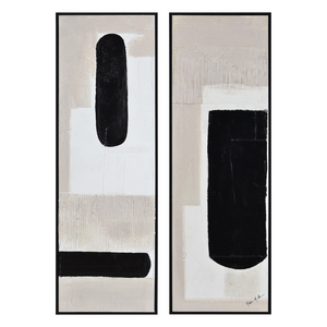 A yin and yang of art, these designs complement and contrast one another in the modern interior. With a simple layout, the hand-painted pieces possess a daring quality that stays on the mind even after exit. Thin flush black frames are the optimal fit for the black strokes on the cotton canvases.