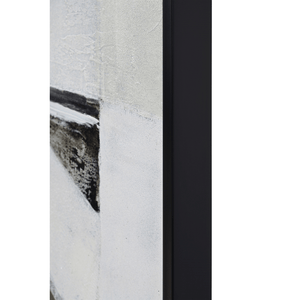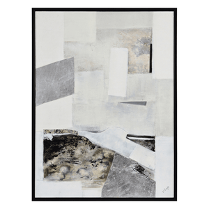 Elements of silver paper, black sand and gel form a collage of refinement in this work of art. Hanging horizontally or vertically on the wall of the neutral-toned contemporary interior, it adds complexity to the space without causing a clash. Its rectangle shape offers plenty of space for each component within its design to take the spotlight.