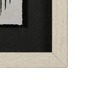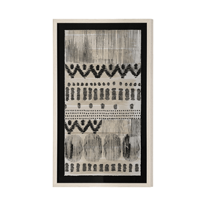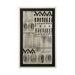This tribal inspired piece takes its design from silk and wool woven textiles, making it easy to place with its neutral tones and black patterns. The image has a hand torn edge reminiscent of a piece of ripped fabric. Showcased with black hand embellished patterns, shadow boxed in black and framed in a natural colored molding, it is sure to catch one's eye.