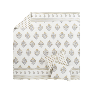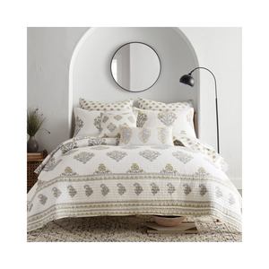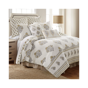The Kamira Reversible Quilt Set by Levtex Home is inspired by summer country gardens. Offered in ochre and spa colors, this design will immediately transform your bedroom. This reversible quilt features a unique flower bush with a distinctive bottom border on the front, reversing to a miniature flower bush on the back.