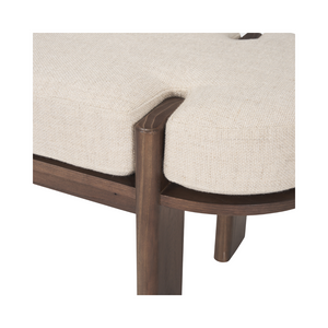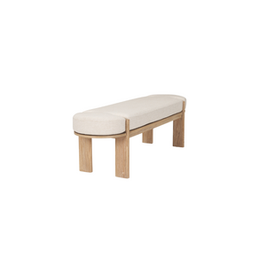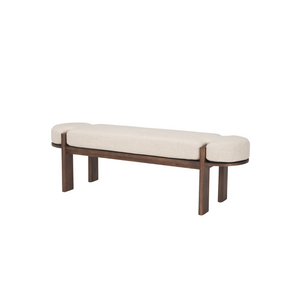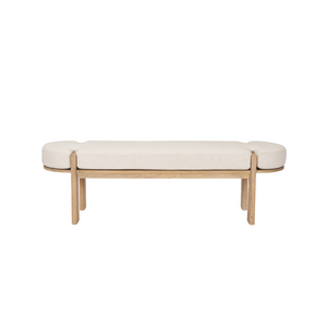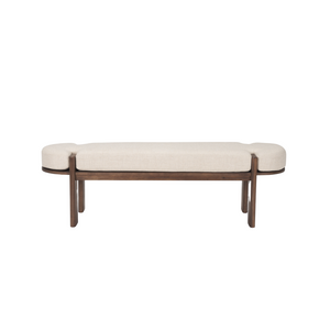 Sohan is a neutral, contemporary bench featuring clean lines, curved edges, and an oblong shape. Crafted from solid elm wood and finished with a contrasting, rich dark brown stain, its removable cushion, upholstered in a desirable oatmeal fabric, offers both sophistication and convenience. Both the cushion and its cover can be easily taken off for hassle-free cleaning.