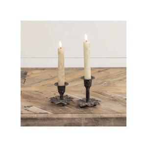 Add a touch of rustic elegance to your space with the 2.75" Rustic Leaf Taper Candle Holder. Crafted with a vintage-inspired design, this petite piece features a beautifully detailed leaf motif and a weathered finish that evokes the charm of antique metalwork.