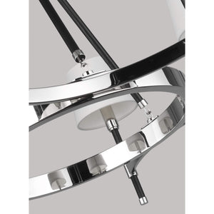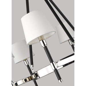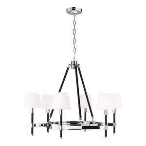 The attention to detail on this chandelier is second to none, with a time worn brass finish, hand-stitched leather accents and white linen shades.