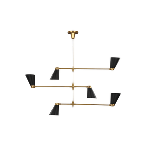 The Signoret chandelier in burnished brass is hand carved from wax, as the wax melts the metal takes it stunning shape. Each tier is composed of two elongated, matte-finished, steel shades that sit on the end of a Burnished Brass arm. Shades can be rotated around the lightbulb to cast the light in the directions that best suit the room.