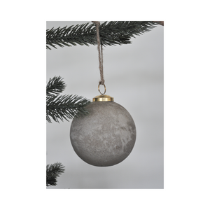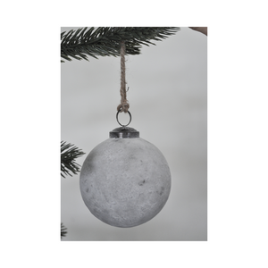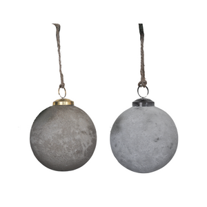 These are vintage-inspired, rustic hanging ornaments featuring spherical designs with a distressed finish. Each ornament has a textured surface in earthy tones—one in a grey, weathered style and the other in a rusty brown hue. Topped with antique-style brass caps and suspended by jute twine, they offer a charming, handcrafted aesthetic perfect for holiday décor or year-round rustic accents.