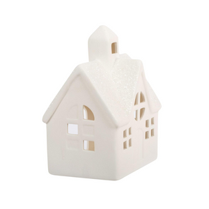 Part of our mini white house's collection. This mini white house is lit from within, with a beautiful warm led light peaking through the cut outs. The roof is sprinkled with a simple glazing of fresh snow.