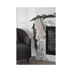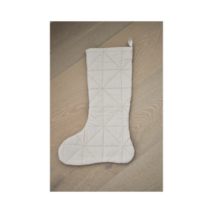 This beautifully quilted stocking, made from a luxurious blend of linen and cotton, is accented with delicate gold thread for a festive touch. Its classic design combines cozy texture with a hint of shimmer, making it a timeless addition to your holiday décor. Perfect for hanging by the fireplace, this stocking brings warmth and elegance to your Christmas celebrations.
