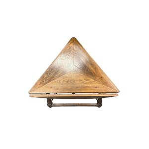 This found round collapsible table features a clever design that folds down on three sides, transforming from a circular top into a compact triangular shape. Both functional and visually intriguing, it offers versatility while maintaining a classic look. A unique accent piece that blends craftsmanship with smart design.