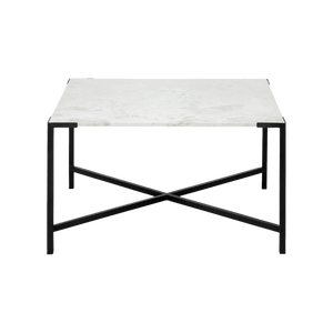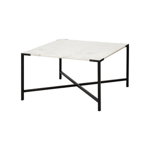 The Lucas is a ritzy, square-shaped coffee table featuring a white, marble top that flaunts a natural, crackled pattern. The luxurious marble top is perched atop a four-legged, matte-black polished iron frame with cross bracing for added stability.