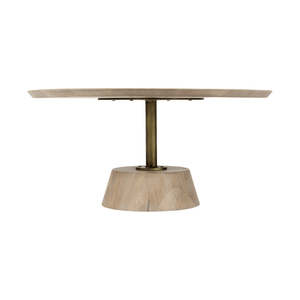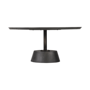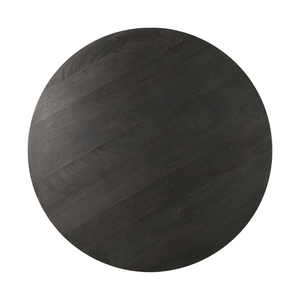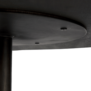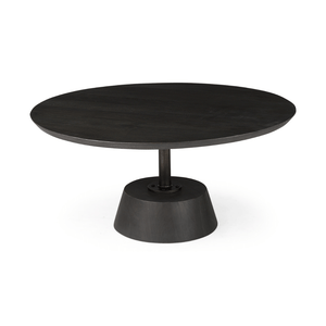 The Maxwell's simple, round top, made from solid Mango wood, sits upon a slender iron rod anchored by a tapered wooden base in an understated, yet eye-catching design.