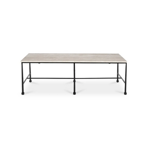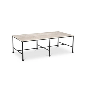 Anchored by a sleek iron base adorned with hammered details, the River coffee table's square base sculpture detail injects an unmistakable artistic flair that is crowned with a soft Italian Botticino marble top. The striking contrast of textures enhances visual interest that captivates and endures.