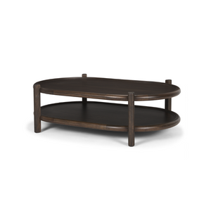 The Romi Coffee Table is crafted from mango wood and finished in a rich, dark brown stain. A curved rim carved from solid mango wood surrounds the oval tabletop and bottom shelf, adding complementary detailing to the otherwise classic design. Its dual-tiered structure provides ample surface area for displaying decor, while the rounded legs add a subtle touch of refinement.