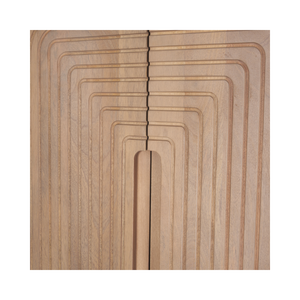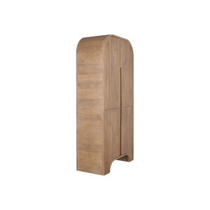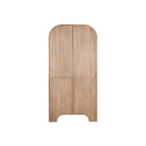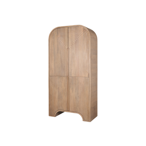 Sorina Curio Cabinet is crafted from solid mango with CNC doors, featuring a unique reverse fluted design that adds depth, texture, and character. Made from solid mango wood in a light brown finish, each door showcases the natural beauty of the wood, with recessed handles seamlessly integrated into the intricate fluted pattern.