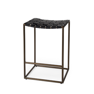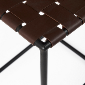 The Clarissa is finished with solid black iron legs and a brown leather seat in a woven formation. The Clarissa is a versatile counter stool, with a simple design that allows you to add functional seating space that is stylish and unique. Designed to complement industrial styled spaces, the Clarissa counter stool blends seamlessly into spaces where clean lines and dark accent pieces are present.