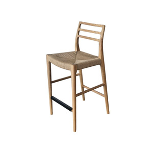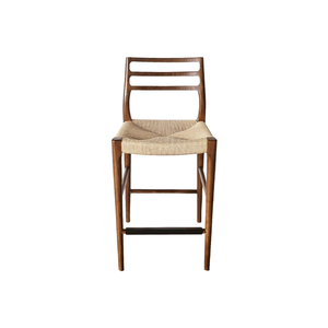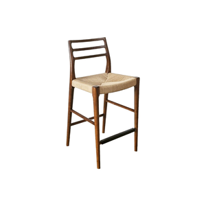This Counter Stool, crafted with a solid ash wood frame and featuring a handwoven paper loom seat cushion in a distinctive four-way pattern. A black metal bar in the footrest adds durability and protects against wood scratches, ensuring lasting quality.