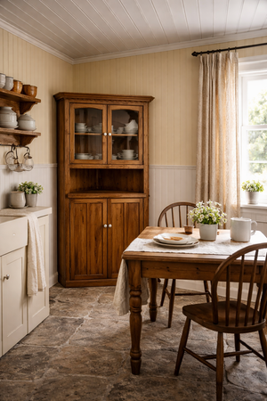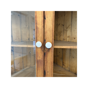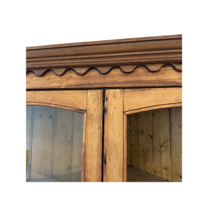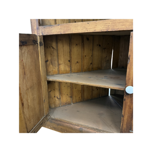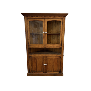 Found Corner Hutch is a charming and practical furniture piece that maximizes space while showcasing your décor. Please note it is missing one front glass panel, yet its classic design and elegant shelving still make it perfect for displaying collectibles, china, or decorative accents.