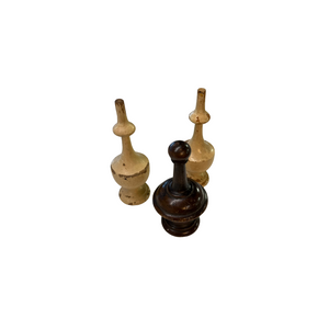 These antique petite finials are crafted from richly aged wood, showcasing intricate detailing and a warm, natural patina. Perfect for adding a touch of vintage charm to any décor project.