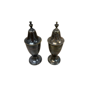 This antique silver floral salt and pepper set features intricate floral detailing and a classic, elegant design. Perfect for display or use, it adds a touch of vintage sophistication to any table or collection.