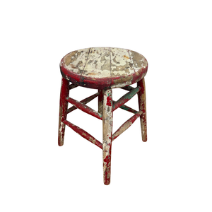This antique found wood work stool features charming paint-chipped detailing that highlights its authentic, well-worn character. Sturdy and full of personality, it adds a touch of rustic, lived-in appeal to any space.