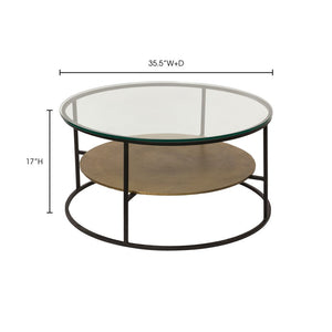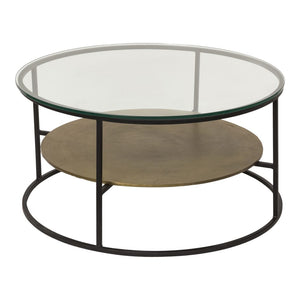 The stylish Callie Coffee Table features a circular design with a fixed metal shelf in a brass finish, visible through the tempered glass top making it light and sleek.