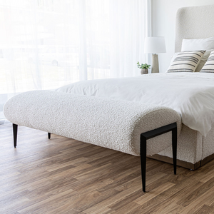 This modern bench just might be the perfect piece of furniture. Upholstered in a stylish off-white boucle fabric and featuring black metal legs, this bench adds a stylish finishing touch to your space. Dreamy at the end of a bed, dramatic in an entryway, and stunning as a dining bench, Fisher gives you endless possibilities.