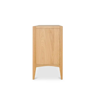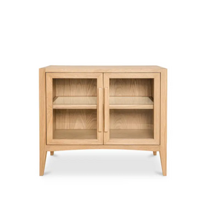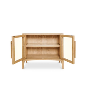 Adding texture and visual intrigue with mixed materiality and supported by a beautifully sculpted solid oak frame, the Harrington small cabinet’s shelves are made from woven natural cane—beautiful detailing that is revealed through its tempered glass doors punctuating its airy design. Fine craftsmanship brings a contemporary touch to a rustic feel adding eye-catching allure.
