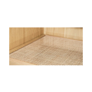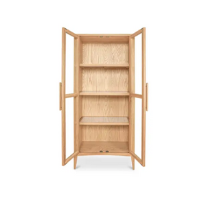 Adding texture and visual intrigue with mixed materiality and supported by a beautifully sculpted solid oak frame, the Harrington tall cabinet’s shelves are made from woven natural cane—beautiful detailing that is revealed through its tempered glass doors punctuating its airy design. Fine craftsmanship brings a contemporary touch to a rustic feel adding eye-catching allure.