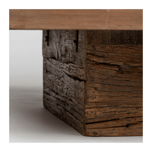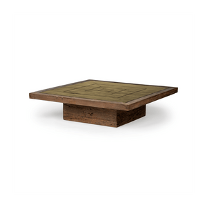 The Kandinsky is an exceptionally designed coffee table that features a sturdy base that is meticulously crafted from reclaimed wood and finished in a natural, dark-brown polish that highlights the grain and variation of the wood. Atop the sturdy base is a unique, metal cladded reclaimed wood tabletop with intricate, concentric square grooves that add to the visuals of this stylish piece.