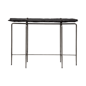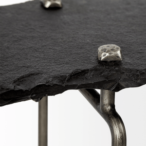 A unique choice of material, the Pinera sports a black, slate top with an all-natural edge. Finished in its natural color and character, the slab is sanded just enough to make sure the edges are safe, so it still maintains its natural, grainy character. The slab is supported by a six-legged, geometrically appealing iron frame which not only looks great but also stabilizes the table to perfection.