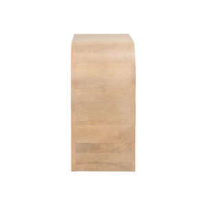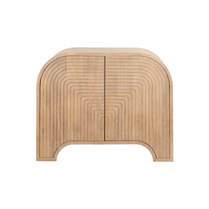 Sorina Accent Cabinet is crafted from solid mango with CNC doors, featuring a unique reverse fluted design that adds depth, texture, and character. Made from solid mango wood in a light brown finish, each door showcases the natural beauty of the wood, with recessed handles seamlessly integrated into the intricate fluted pattern.