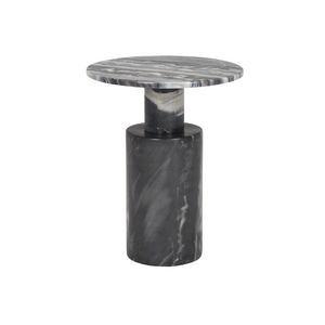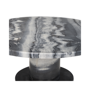 The Taite Accent Table is carved from a unique gray marble, presenting a mesmerizing interplay of light and dark swirls, accentuated by a cool blue undertone. This exquisite accent table is solid marble, exuding quality and luxury. Make a bold statement with the exquisite masterpiece.