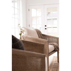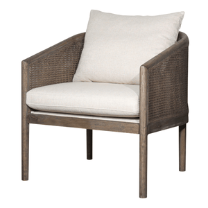 In a contemporary shape the Theodore perfectly mixes in traditional elements of cane webbing and beautifully upholstered cushioning in an off-white natural color. Includes backing cushion.