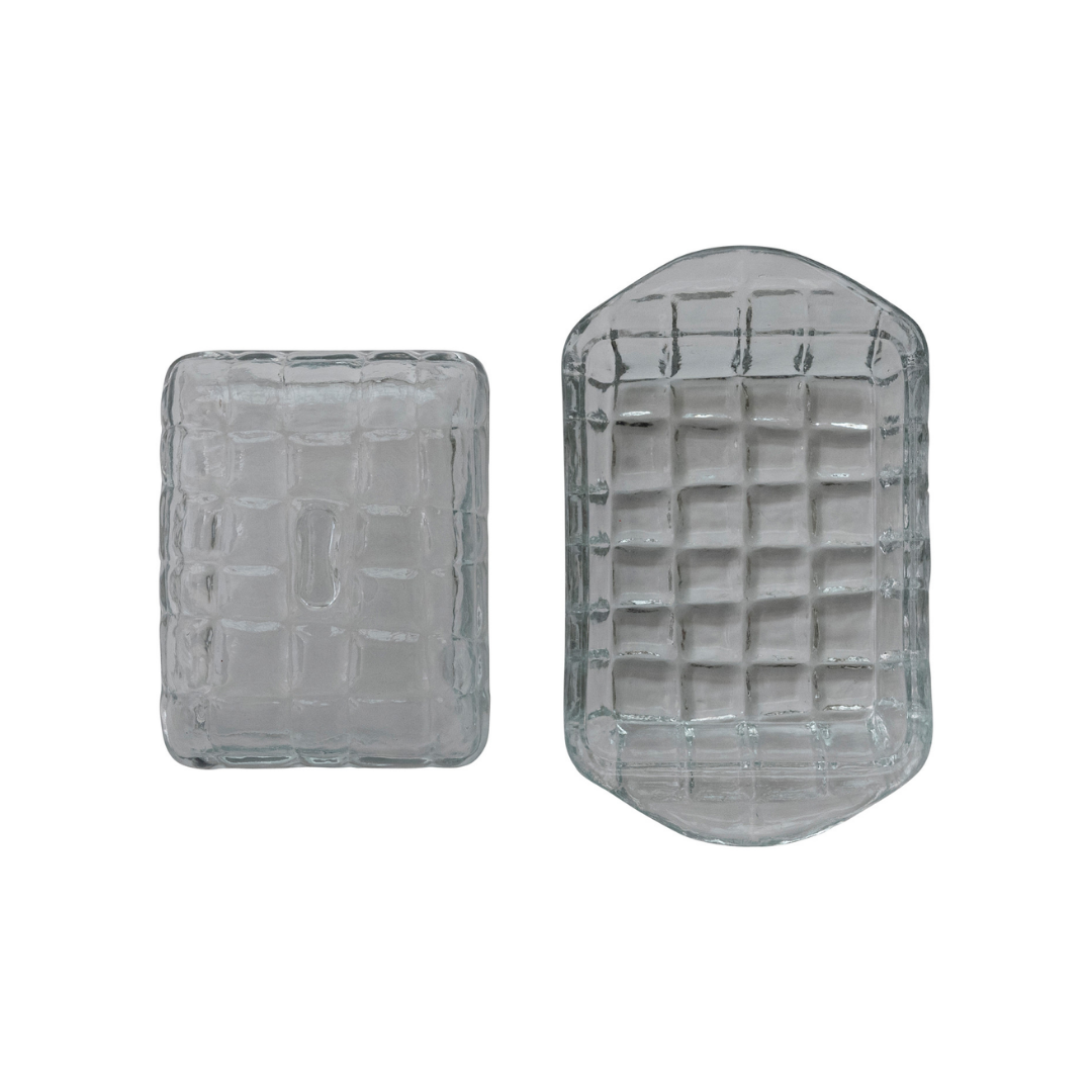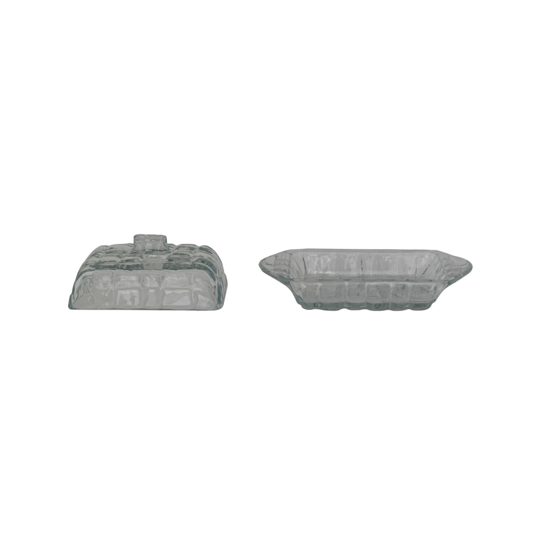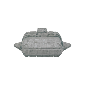 The Pressed Glass Butter Dish features a classic grid pattern that adds texture and vintage-inspired charm to the table. Its clear glass design offers an elegant way to serve and store butter while complementing any kitchen or dining setting.