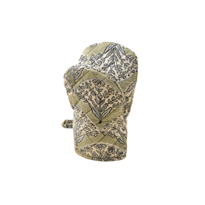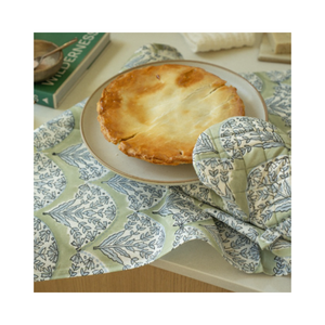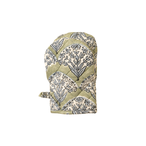 Add charm and practicality to your kitchen with the Sakura Block Print Oven Mitt. Made in India from 100% cotton, this artisan-crafted oven glove features a soft green base adorned with a fan-like pattern of floral sprays in muted blue, inspired by our traditional hand block printed designs.
