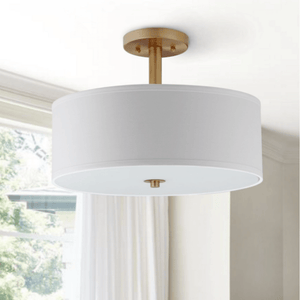 A handsome and understated fixture for transitional or contemporary rooms, the Clara Ceiling Drum light is dramatic in its simplicity and elegance of scale. Crafted with cotton drum shade and gleaming gold accents, Clara casts a stylish glow.