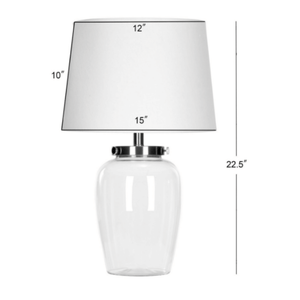 Be creative with the Evan table lamp in clear glass with iron trim in a silver finish. Designed to be used alone or filled with your choice of objects, this lamp pays homage to the glassblower’s art.