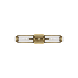 Candelabra-style sockets extend from the left and right sides of a beveled wall mount, each set between an airy assembly of metal brackets. The lamping is damp-rated, and clear glass cylinder shades easily smooth any direct brightness into a more pleasant ambiance around the fixture.