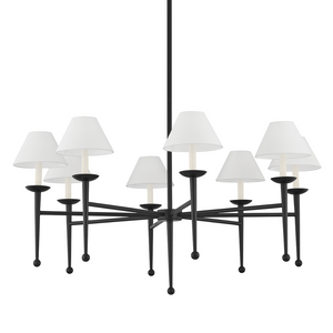 Inspired by traditional design, London makes a statement yet is still understated. Long, straight arms extend downward to round finials on one end and support a distinctly shaped white linen shade at the other. The forged iron finish is unexpected and works beautifully with this crisp, comfortable design.