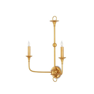 The arms of the Nottaway Wall Sconce stretch gracefully from a half-spool shape that rests at the bottom of its stem, ornamented with a dainty ring. Though this is a seriously minimalist fixture, the profile of the aged wall sconce has a lovely fluidity to it that also makes it a natural choice for traditional and transitional interiors.