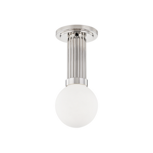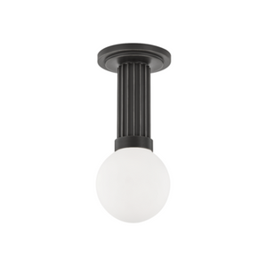 Cylindrical, ribbed metalwork capped by a smooth metal ring is the focal point of Reade's simple yet glamorous design. An opal matte globe gives off a warm and inviting glow. Streamlined and statuesque, Reade is a regal addition to any space. semi-flush in aged brass.