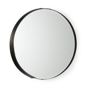 Slivers of flat iron edging encircle the round mirrored glass, leaving two offset gaps that deliver a touch of visual interest and modern elegance, and harmonize perfectly with the matte black finish.