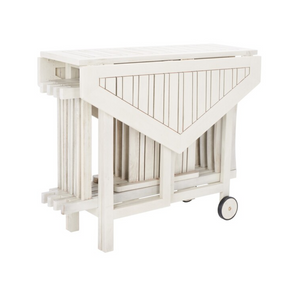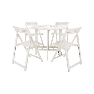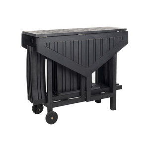Stack the odds for carefree outdoor living in your favor with the ingenious Kerman dining table and chair set. Crafted of eco friendly black acacia wood, 4 director style chairs fold and tuck under a foldable hexagonal table for easy storage.