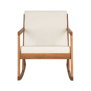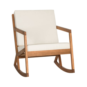 Contemporary with a nod to hand-crafted individuality, this elegant outdoor rocking chair is destined to become a new American classic. Made from Acacia wood in natural finish, it comes with easy-care front and back cushions.