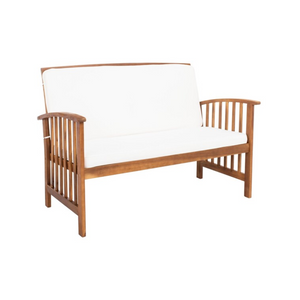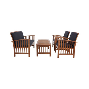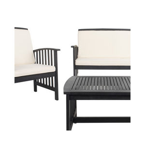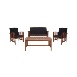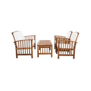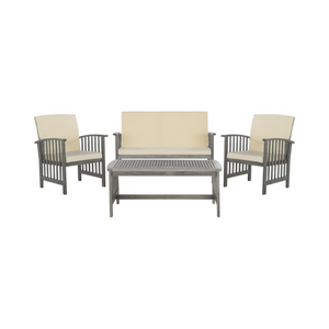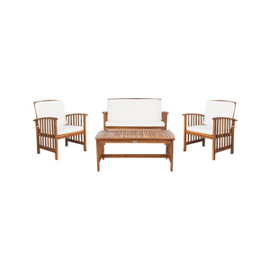The open and airy design of the Rocklin 4-piece outdoor set combines form and function. The slatted silhouette aids rain drainage while creating chic contemporary forms. Crafted of acacia in a natural finishes with beige all-weather cushions.