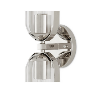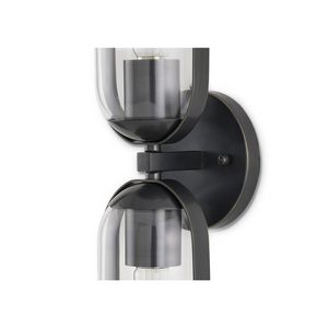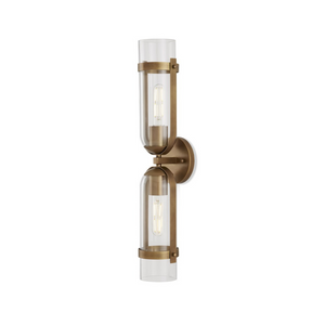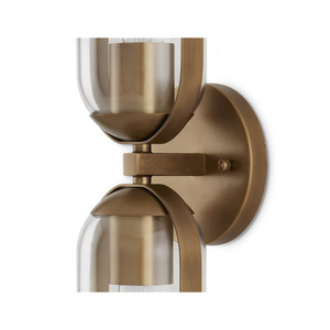 Made of stainless steel, the Bonardi Brass Wall Sconce was designed by Ian Thornton. The matching shades that mirror each other are elongated cup shapes that are perfectly scaled for the cylindrical bulbs. The antique brass finish on the metal brings warmth to this gold sconce, which is included in our Bagno Collection of damp-rated lighting that is designed specifically for bathrooms. This sconce can be mounted sideways to fit over a mirror.