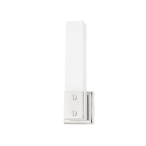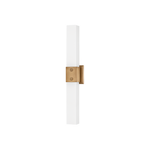 Jonah is the epitome of soft industrial design. The clean lines and defined shape of the sconce body are softened by the acid-etched glass and the beautiful jewelry-inspired hardware on the holder. The coordinating square backplate adds to this stylish sconce's fresh feel. Choose from a one- or two-light option in patina brass or polished nickel.