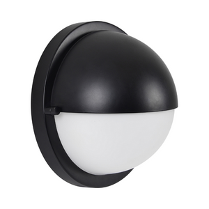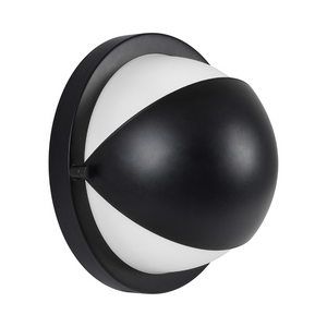 Minimalist details come together to form a striking sconce fit for the modern interior. Painted matte black with a glass etched white globe, its contrasting hues have a bold energy. Eight inches in width and height and four in depth, it is impactful in any space of the home without becoming imposing.